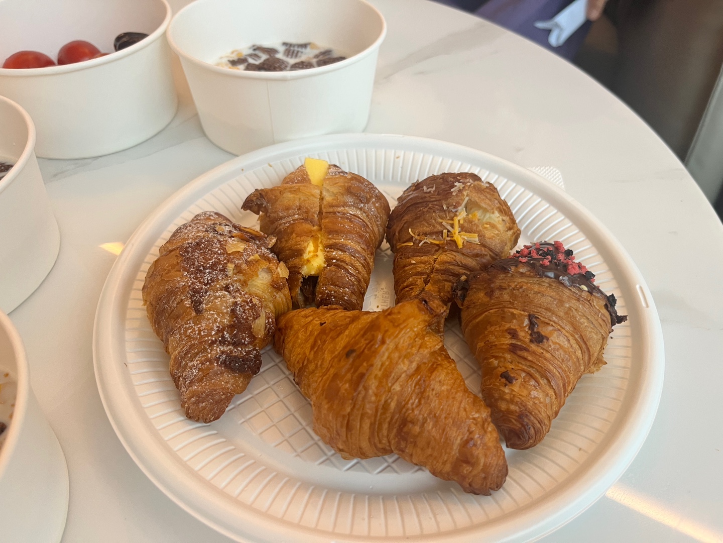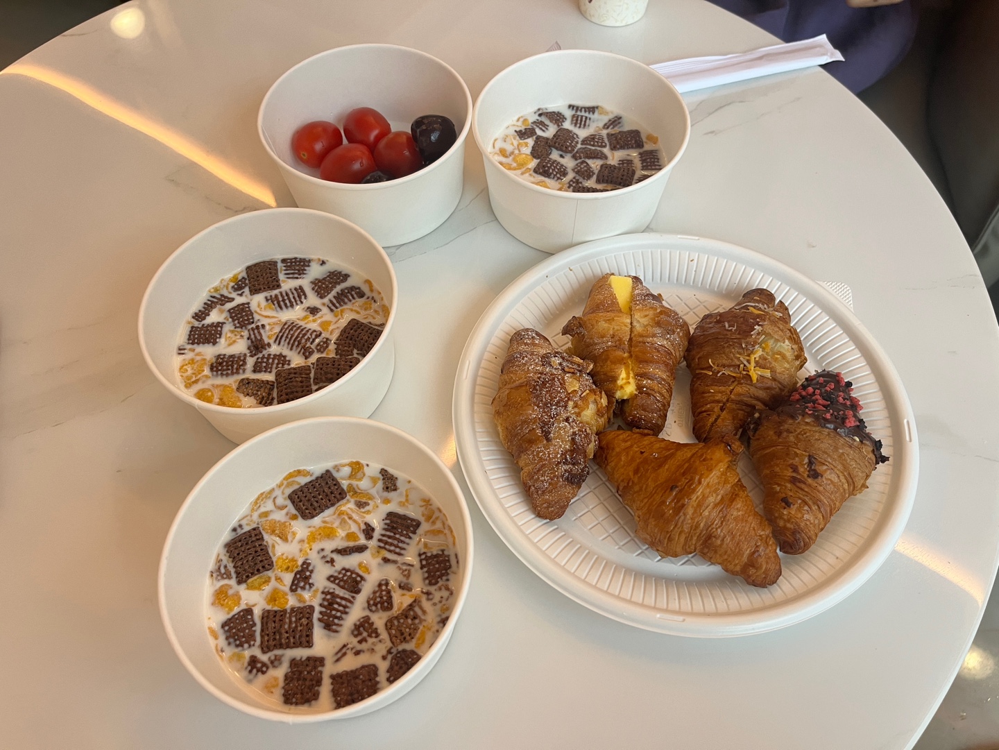 크로와상 약간의 과일 씨리얼 음료