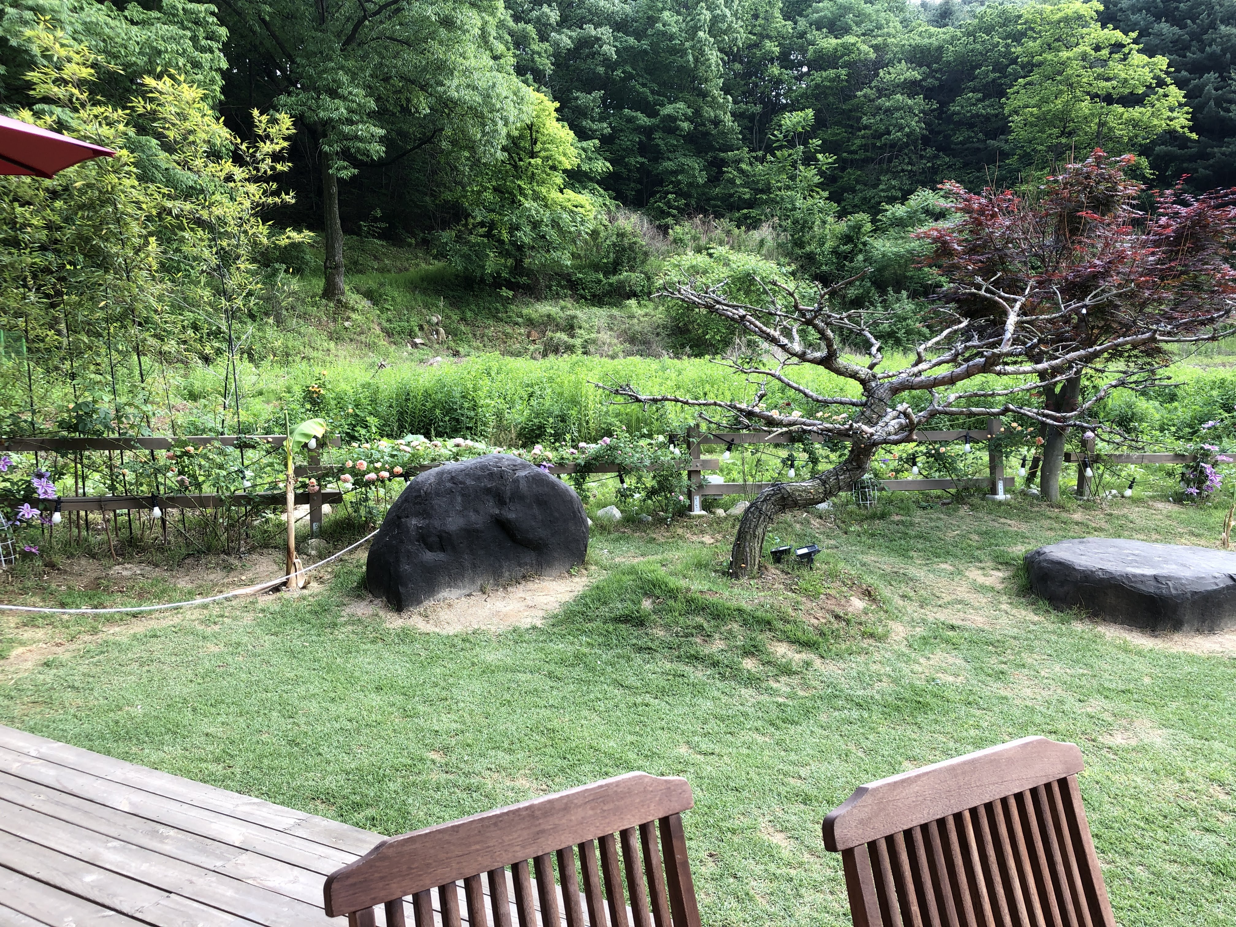 넓은 정원 큰 나무 아래에